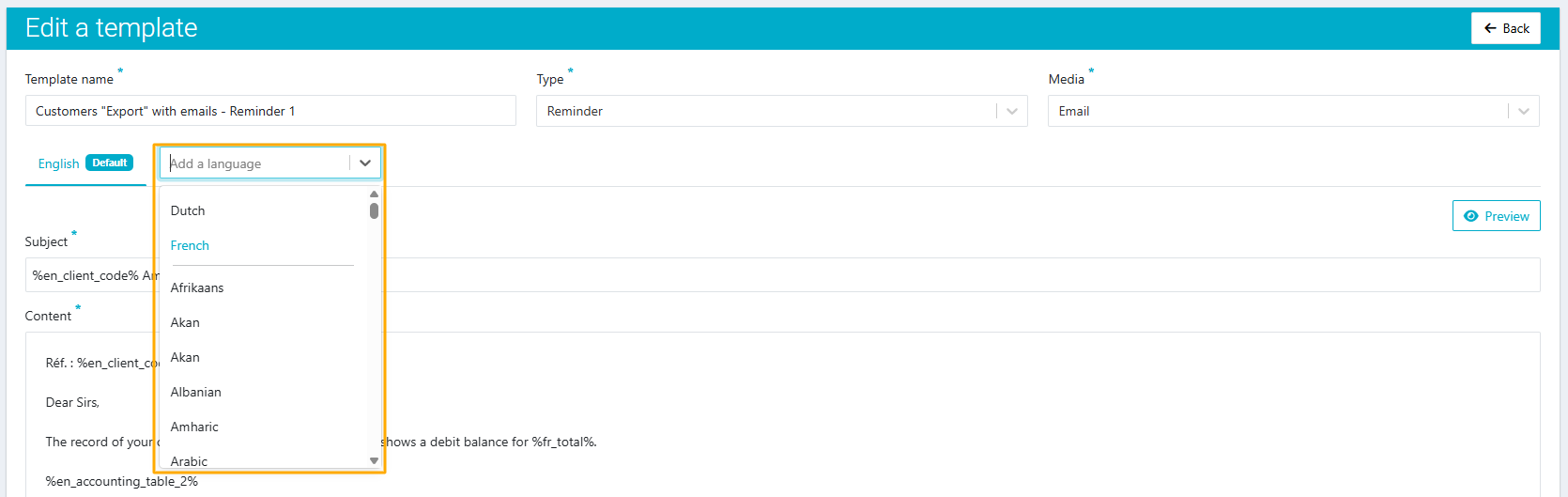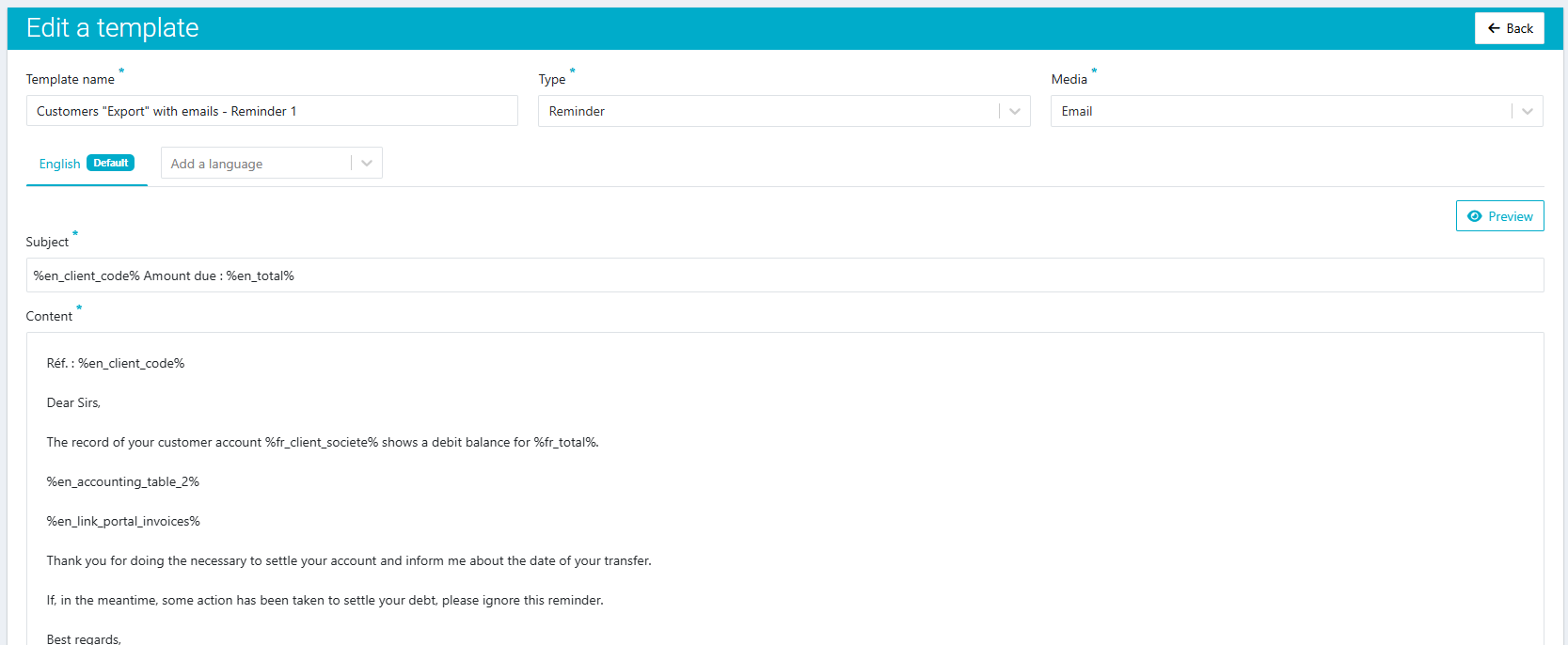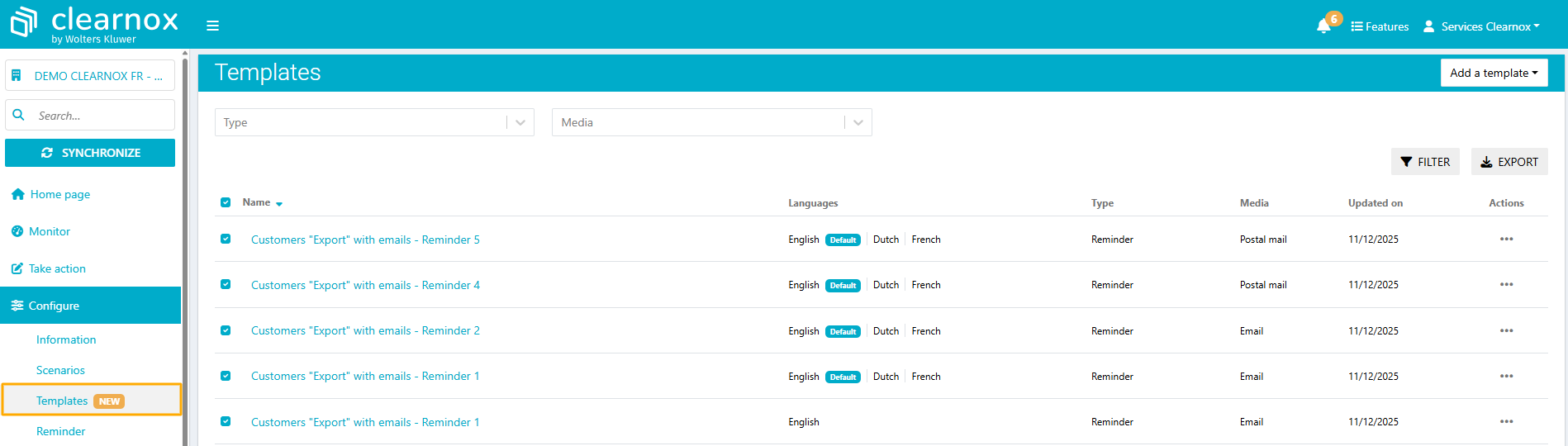 It is essential to be able to customize the content of your reminders so that it can be adapted to each customer profile as well as to the reminder level. To achieve this, Clearnox offers standard templates and the ability to create your own custom templates from the Configure > Templates page.