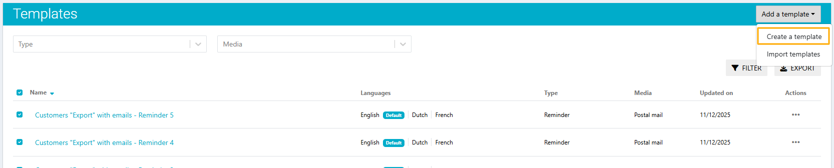 Each template consists of a subject and content, can be associated with a reminder, courtesy notice, or thank-you message for a defined customer profile, and is adaptable according to the chosen medium: email or letter.