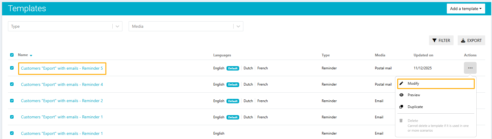 You can also delete the template from the template editing page by clicking on the three dots “···” and then selecting "Modify".