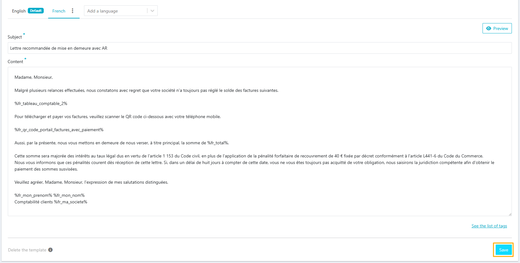 Once the language is selected, translate the Subject and Content of your template into this language. Then click the "Save" button at the bottom right :