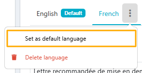 Click on the vertical three dots ( ⁝ ) next to the language you want to set as the default. Then select "Set as default language" and click the Save button at the bottom right of the page :