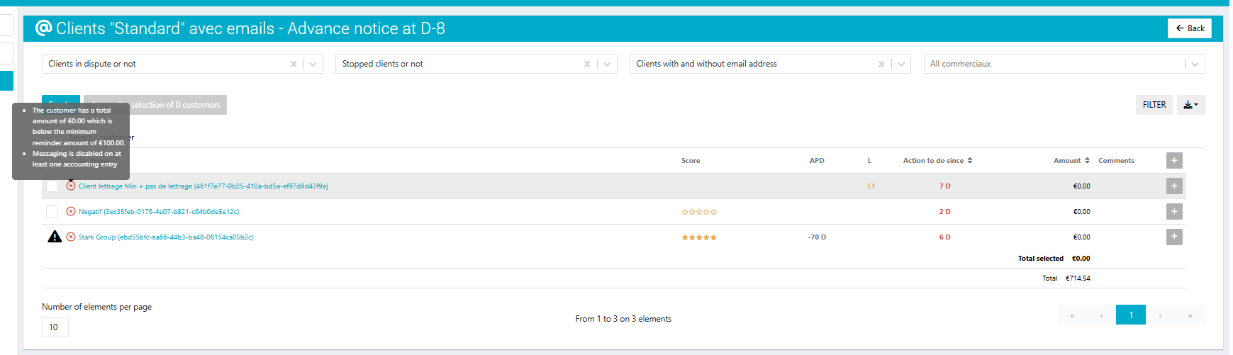 In this case, these creditor clients will appear in the Take action> By scenario and Take action > By criteria pages; however, they are unchecked by default. You simply need to check the entries to be reminded in order to include them in the reminder process.