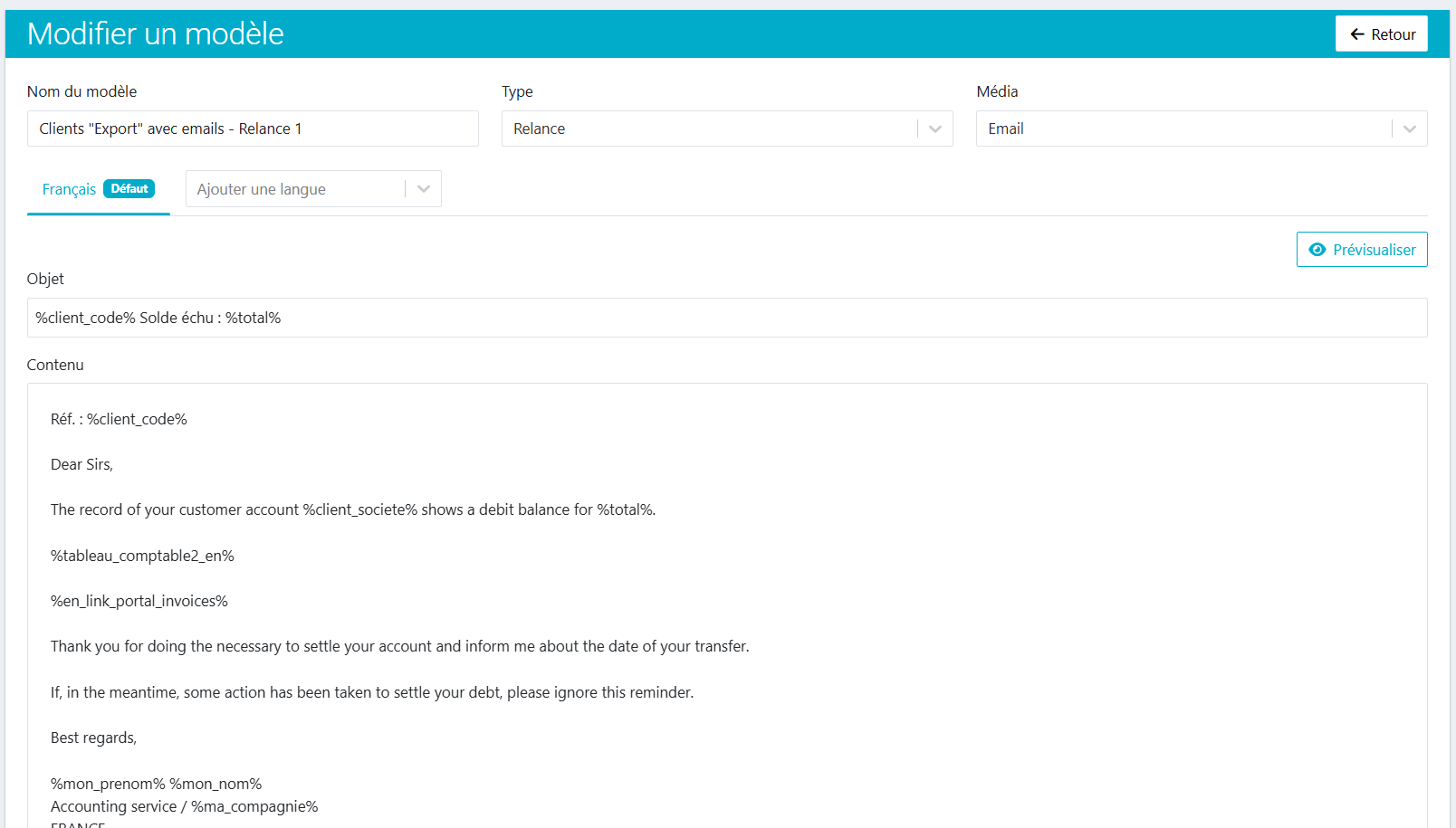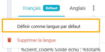 La langue par défaut définit la langue utilisée par l'automate Clearnox dans la relance quand la langue du client n'a pas été configuré dans le modèle.