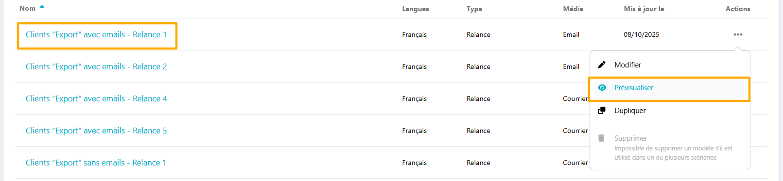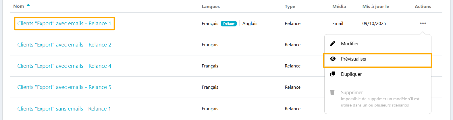 Comme pour la modification, depuis la page des modèles, cliquez sur les trois points "···" puis sur "Supprimer".