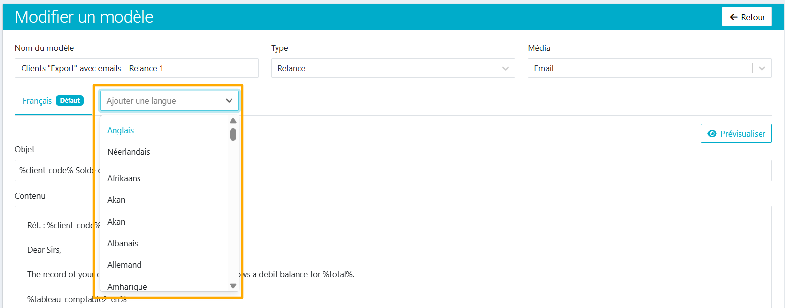 Si vous avez des clients multilingues, vous pouvez ajouter leurs langues lors de l'édition du modèle :