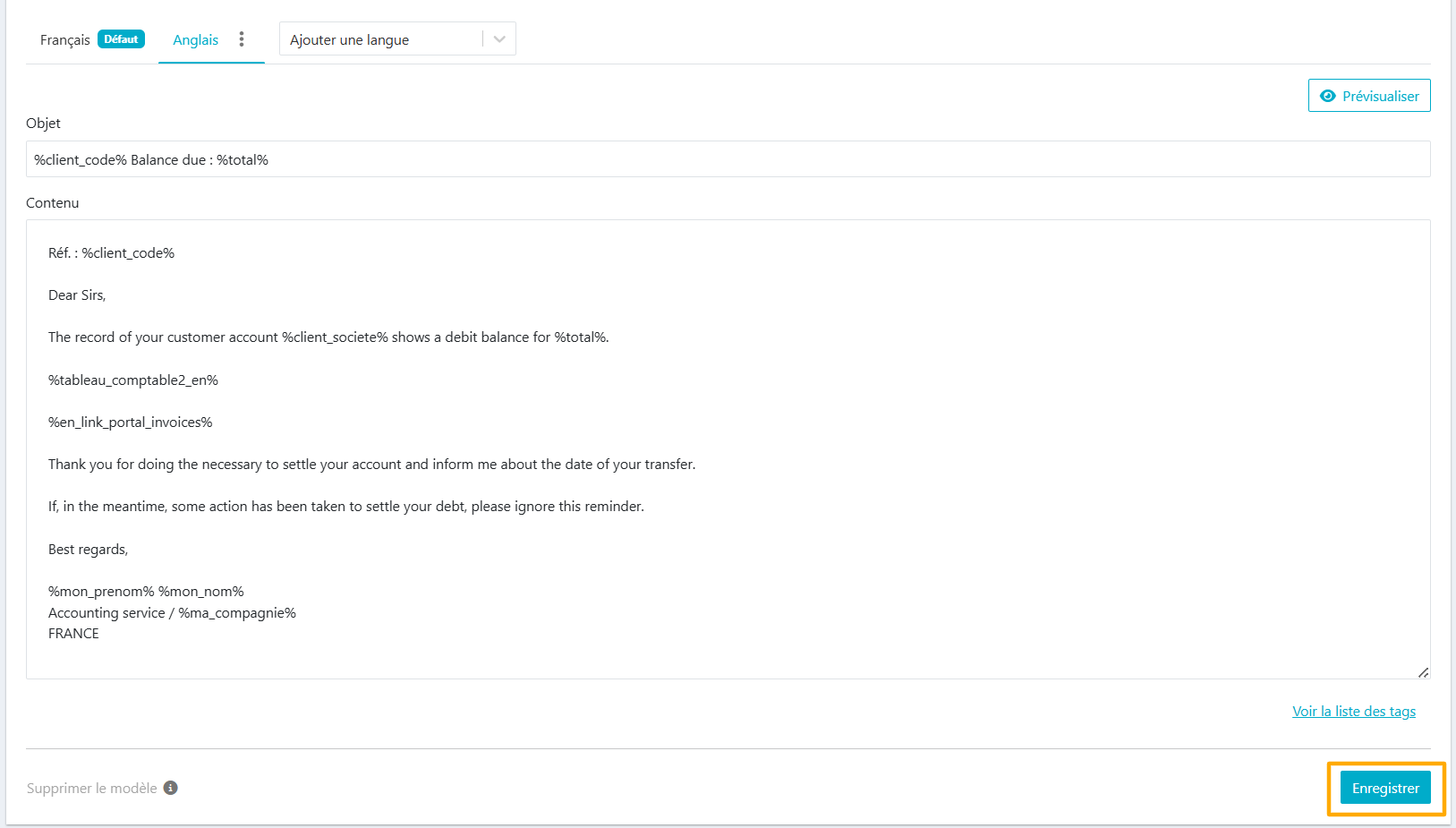 Une fois la langue choisie, traduisez l'objet et le contenu de votre modèle dans cette langue. Puis cliquez sur le bouton "Enregistrer" en bas à droite :
