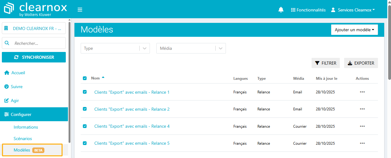 Il est essentiel de pouvoir personnaliser le contenu de vos relances afin de l'adapter à chaque profil client ainsi qu'au niveau de relance. Pour cela, Clearnox propose des modèles standards, et la possibilité de créer vos propres modèles personnalisés depuis la page Configurer > Modèles.