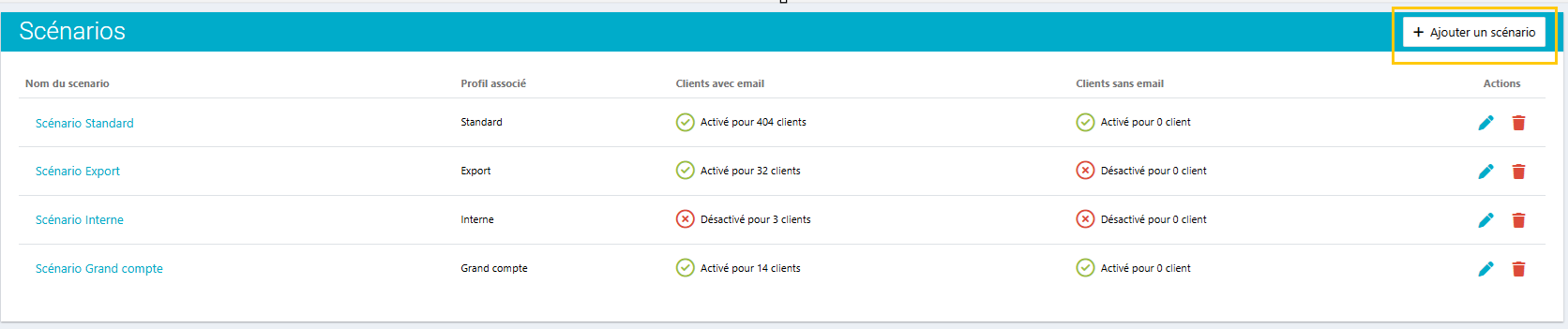Depuis la page Configurer > Scénarios, cliquez sur le bouton "Ajouter un scénario" :