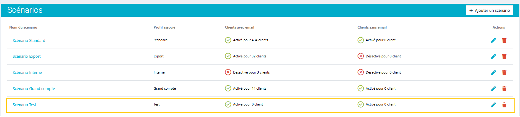 - En revenant sur la page Configurer > Scénarios, une nouvelle ligne s'est ajoutée avec le scénario que vous avez créé.