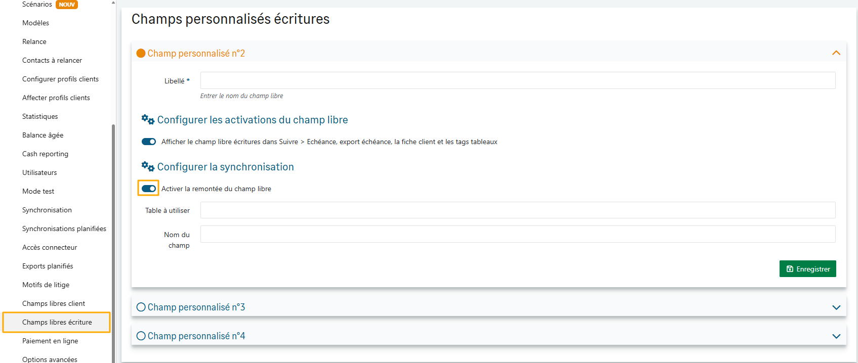 Maintenant que vos champs libres écritures sont correctement synchronisés, vous pouvez activer leur affichage dans votre solution Clearnox comme indiqué ici et les intégrer dans vos relances comme expliqué ici !