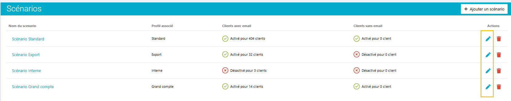 • Depuis la page, Configurer > Scénarios, cliquez sur le crayon dans la colonne "Actions".