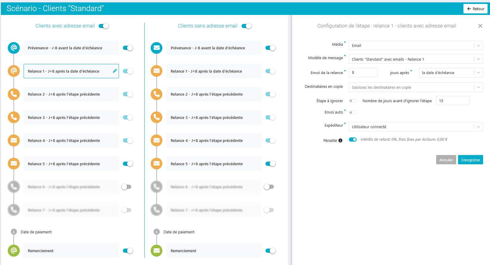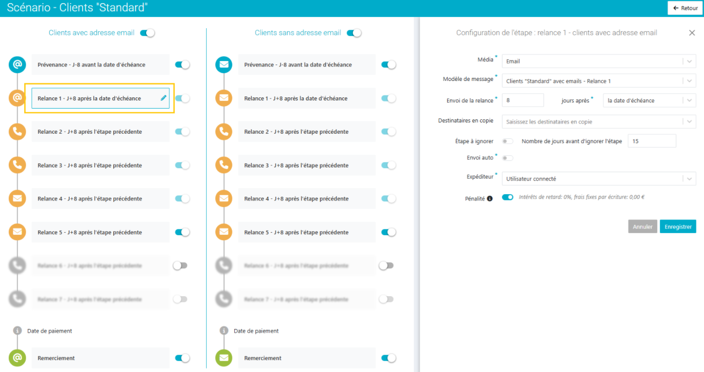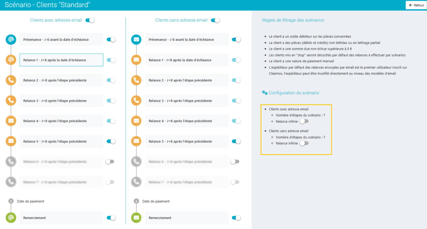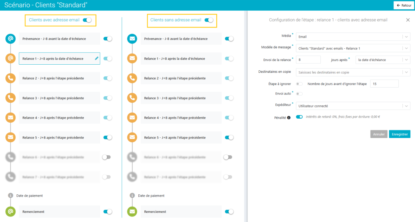• Pour chaque scénario, vous pouvez paramétrer les étapes de relance pour les clients avec email (première colonne) et aussi pour les clients sans email (deuxième colonne).