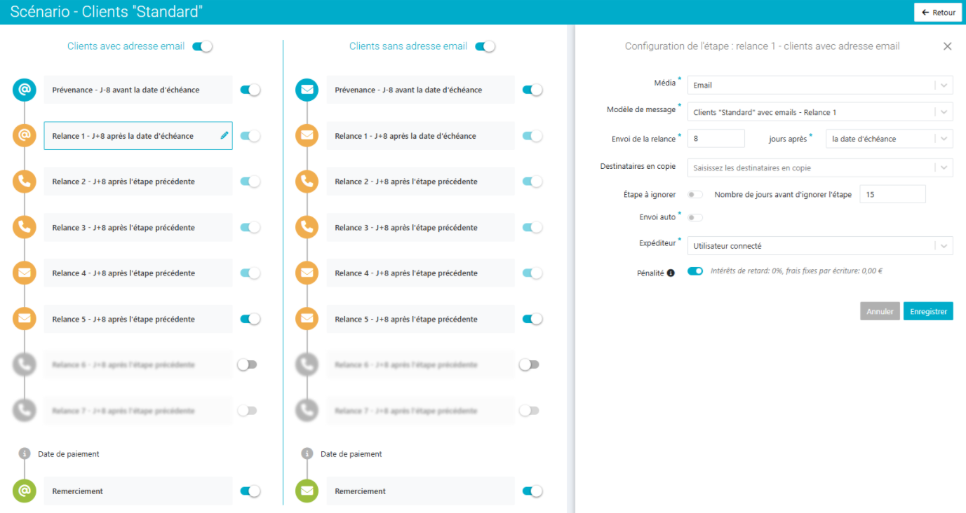 - Activer les pénalités dans l'étape du scénario ne permet pas d'afficher les pénalités dans la relance que le client reçoit. Il faut intégrer un tag incluant les pénalités dans votre modèle de relance associé à l'étape du scénario.