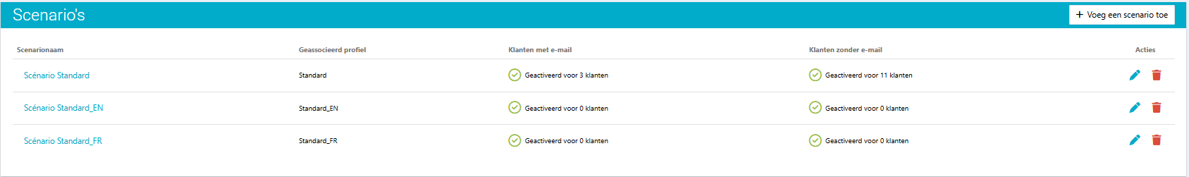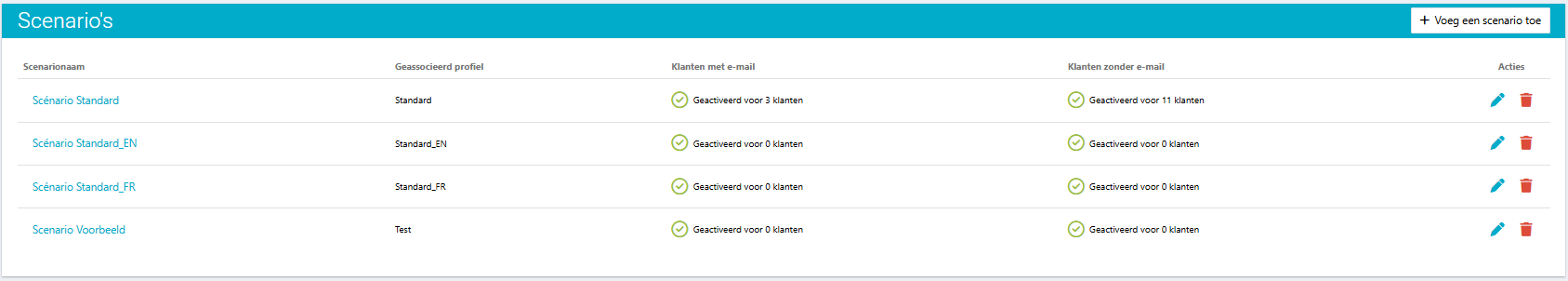 - Bij terugkeer op de pagina Instellingen > Scenarios is een nieuwe lijn toegevoegd met jouw aangemaakte scenario.