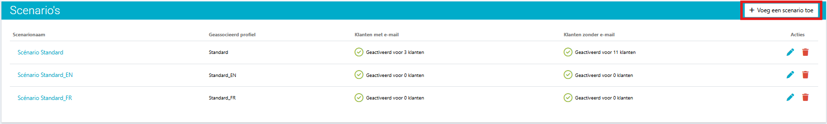 Ga naar de pagina Instellingen > Scénarios en klik op de knop "Voeg een scenario toe" :