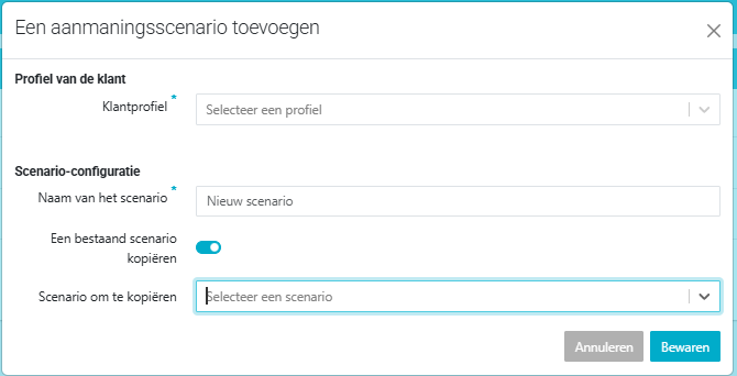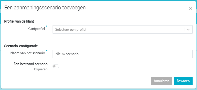 Er verschijnt een pop-up waarin je kan kiezen voor welk klantprofiel je een nieuw scenario wilt toevoegen.