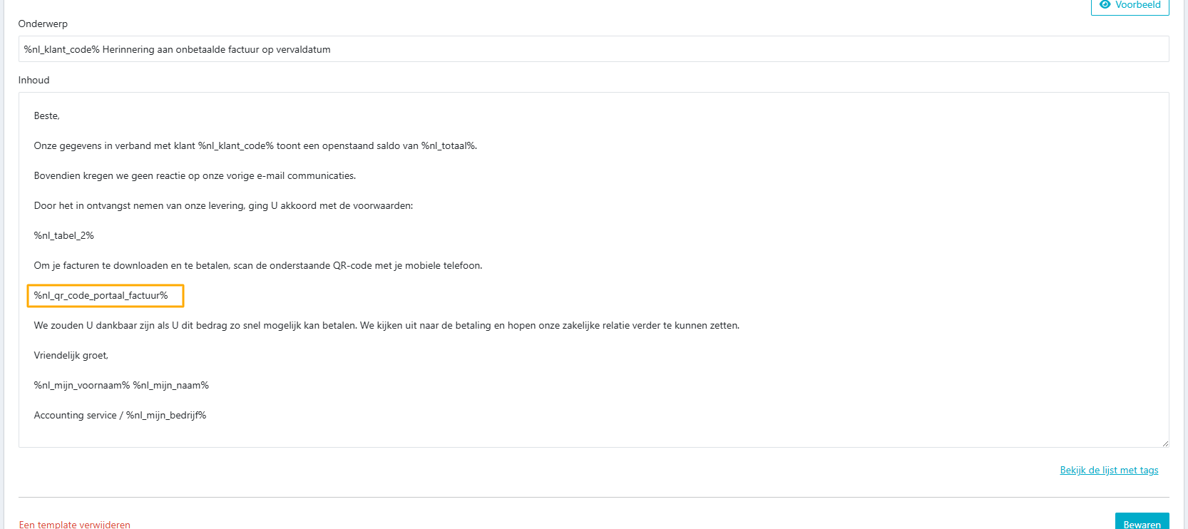 Om de QR-code aan je papieren herinneringen toe te voegen, hoef je alleen maar de tag %nl_qr_code_portaal_factuur% in je herinneringssjablonen te zetten.